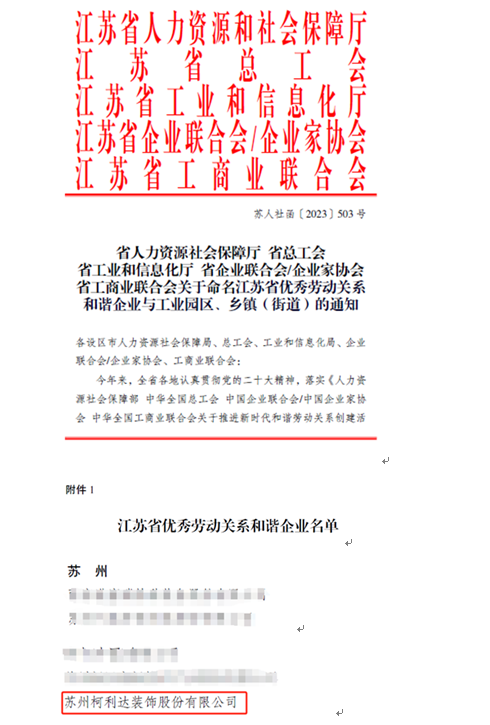 喜報!柯利達榮獲“江蘇省優(yōu)秀勞動關系和諧企業(yè)”